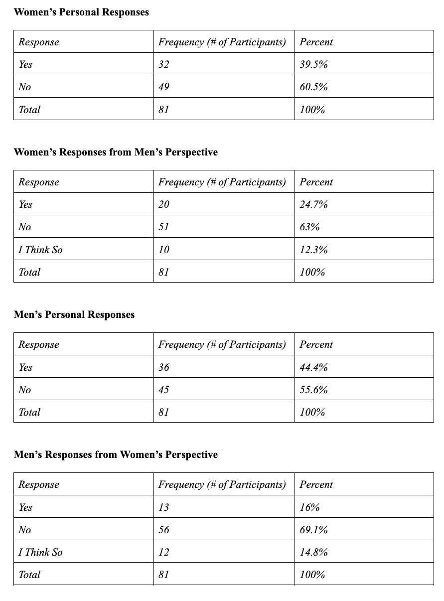 With all the proper consent forms, we created and sent out a survey asking for pairs of male-female platonic friends to respond. It was entirely anonymous. Pairs created a codeword only they two of them would know, and submitted it with their responses. This codeword is how we paired the two individuals together in our data. In total, we had 222 respondents. In this survey, we asked responders to complete a series of questions twice, once from their personal perspective, and the other time from what they believed their friend’s perspective was. Sample questions included: